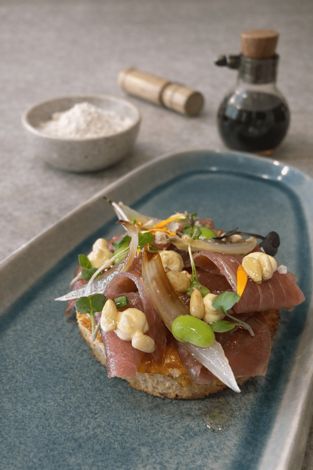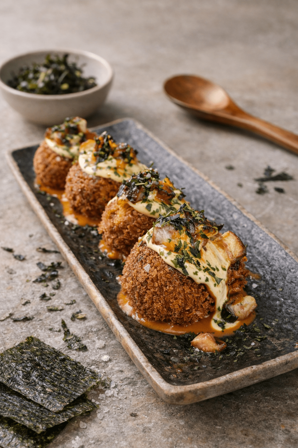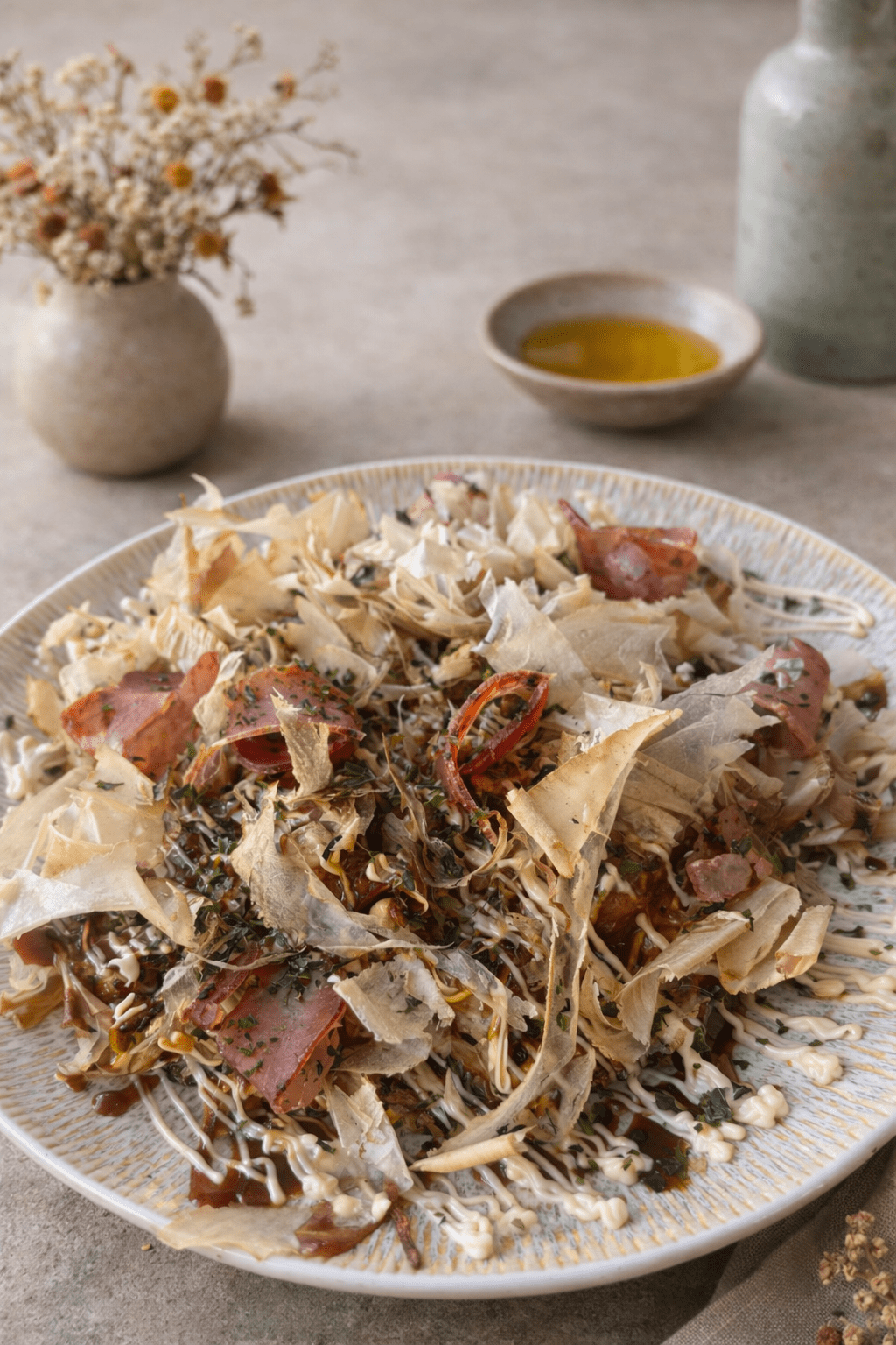Okonomiyaki con titaina del Cabanyal y bonito en dos texturas.