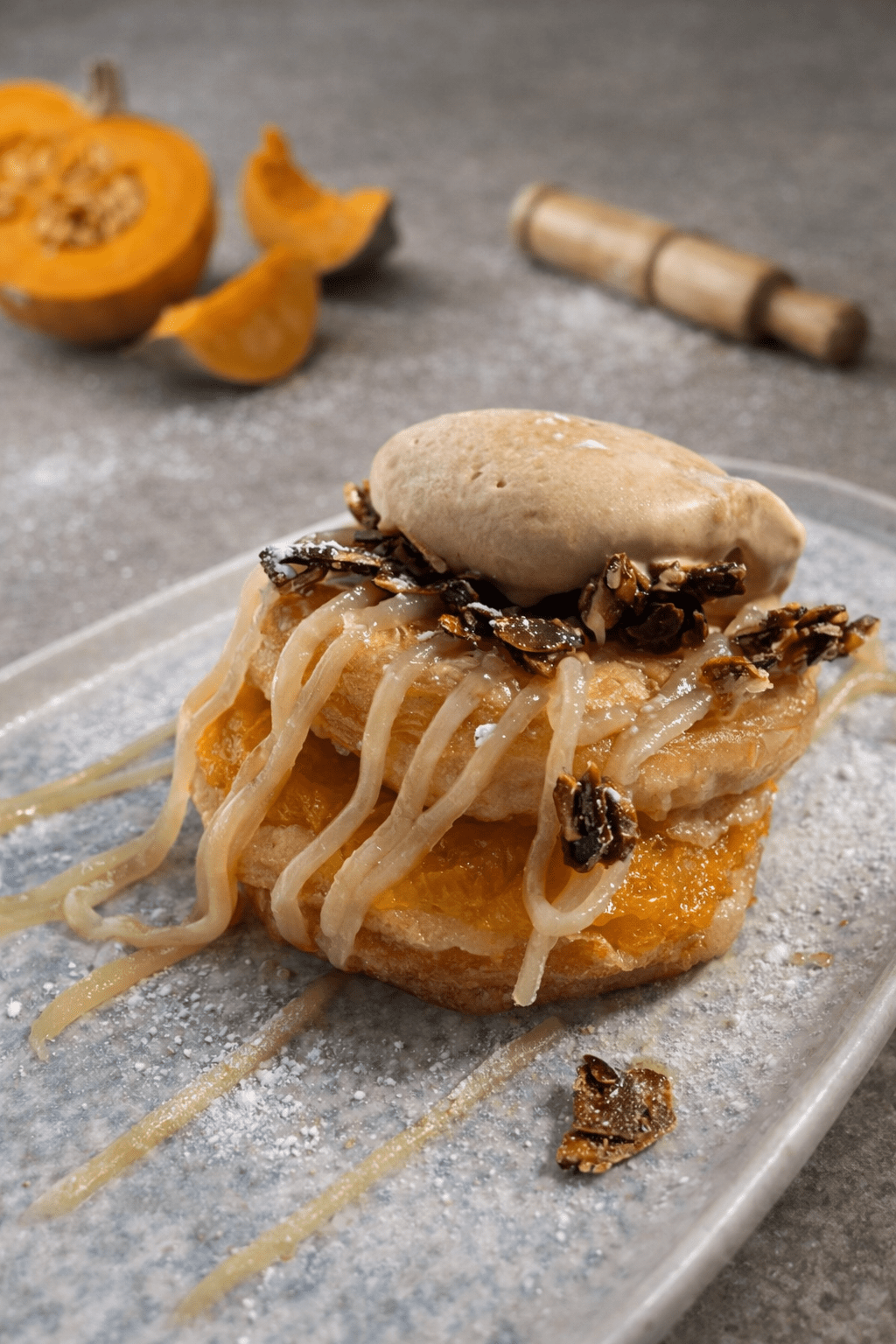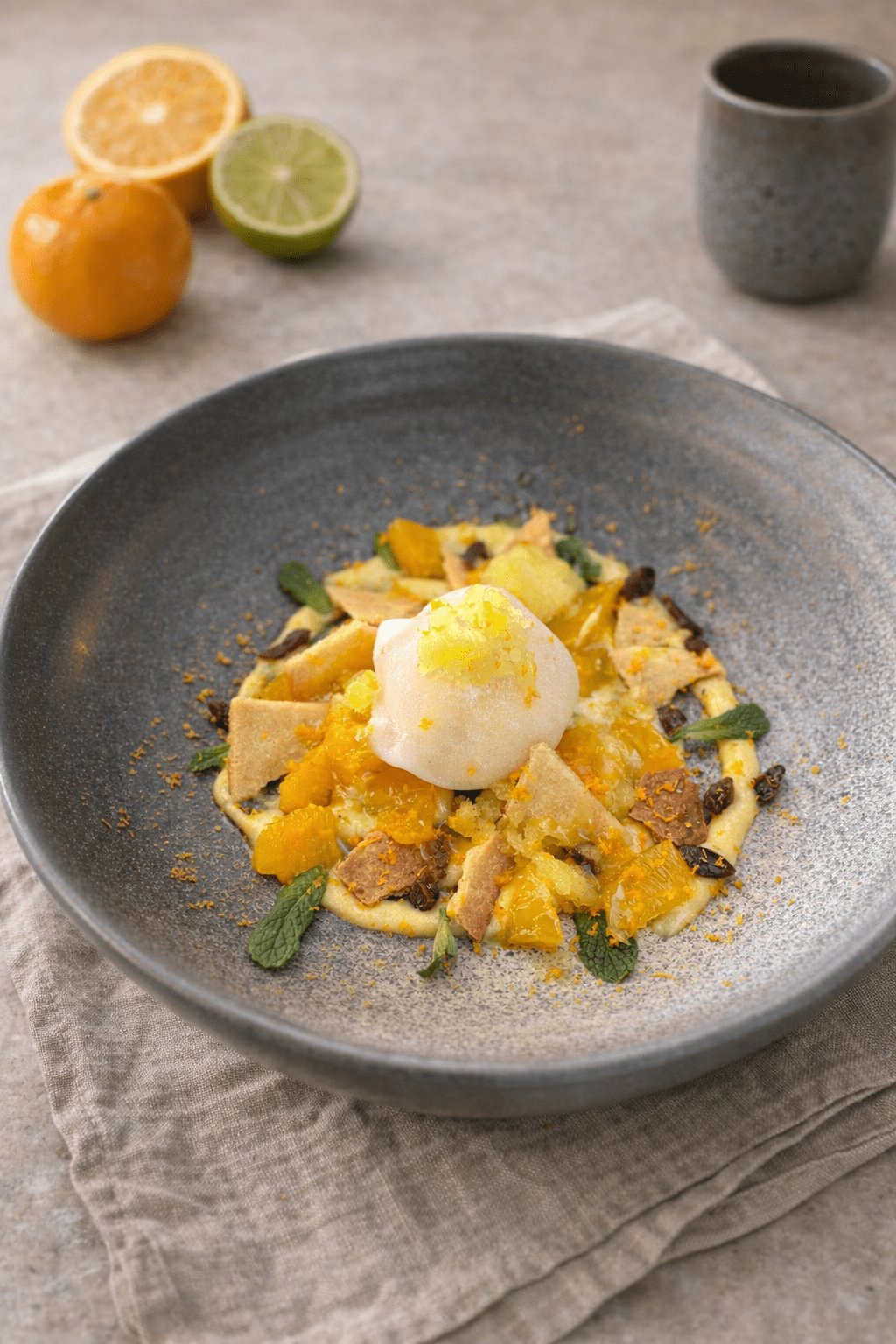 Mochi relleno de naranjas del huerto con toques cítricos.