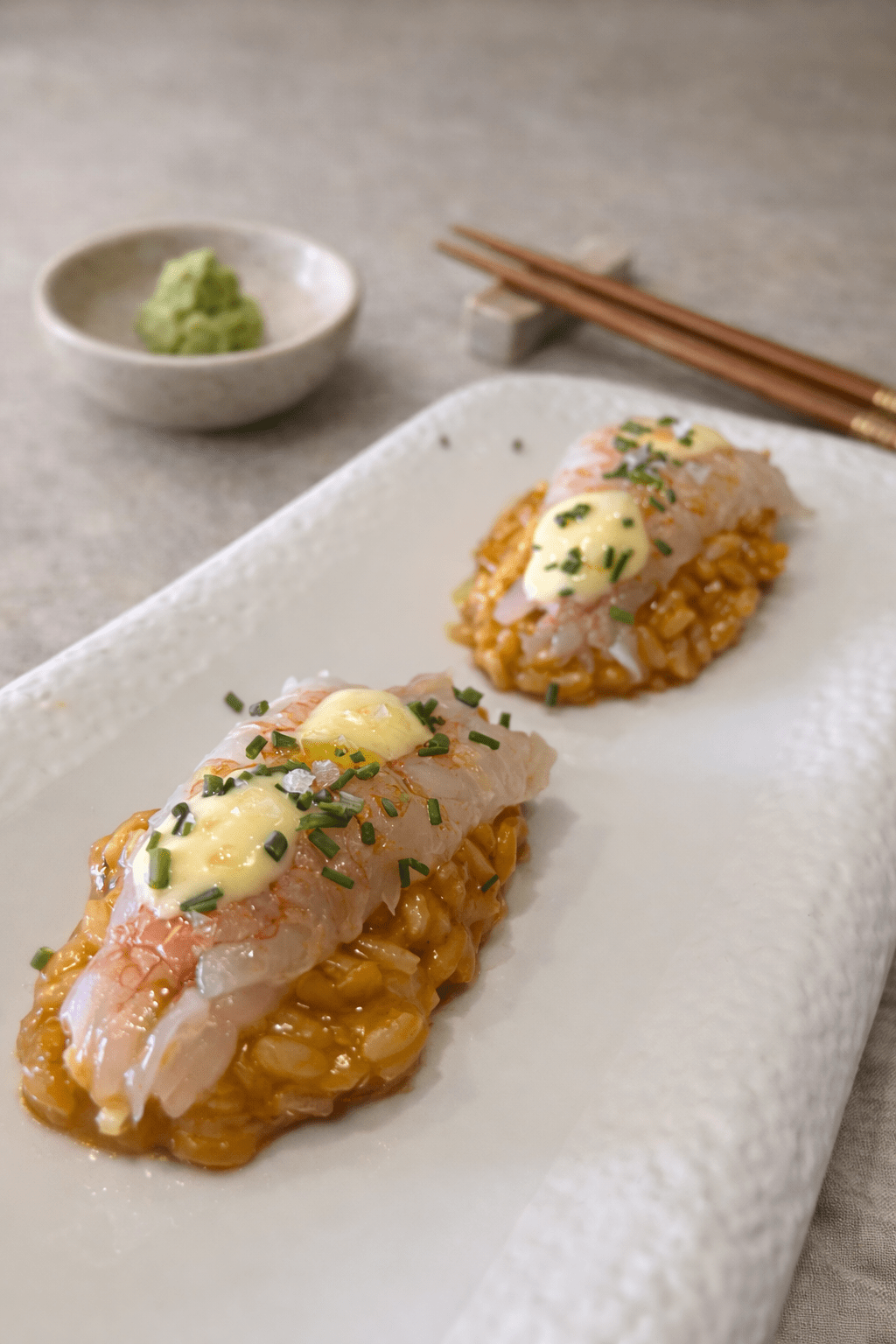 Nigiri de arroz meloso del senyoret con toques de alioli flambeado